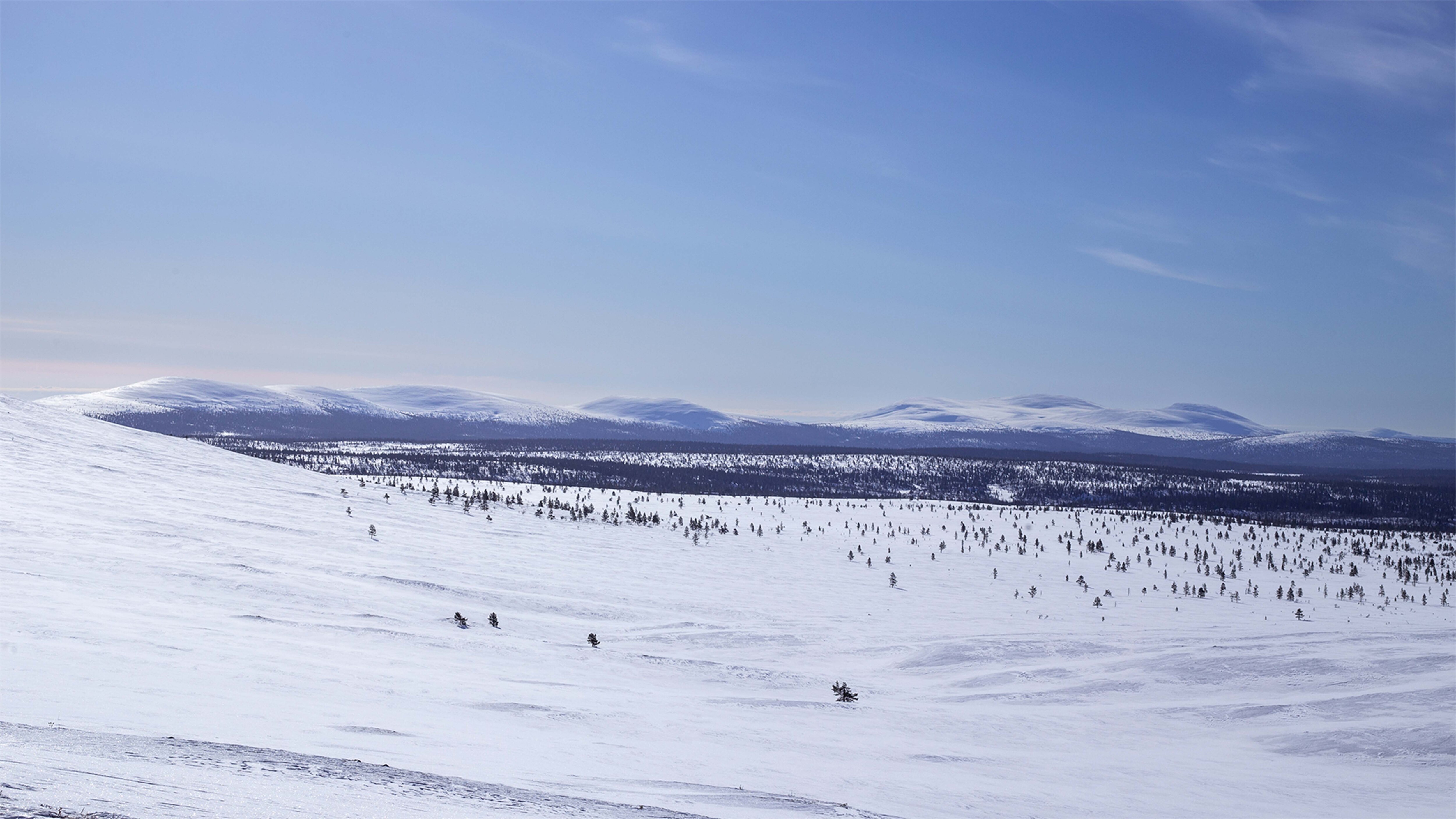 We leave the snowmobiles at the end of the forest road near the border of the national park. We switch our riding gear to hiking clothes and lift our backpacks. We jump on the skis and head to the wilderness hut on the side of the fell.