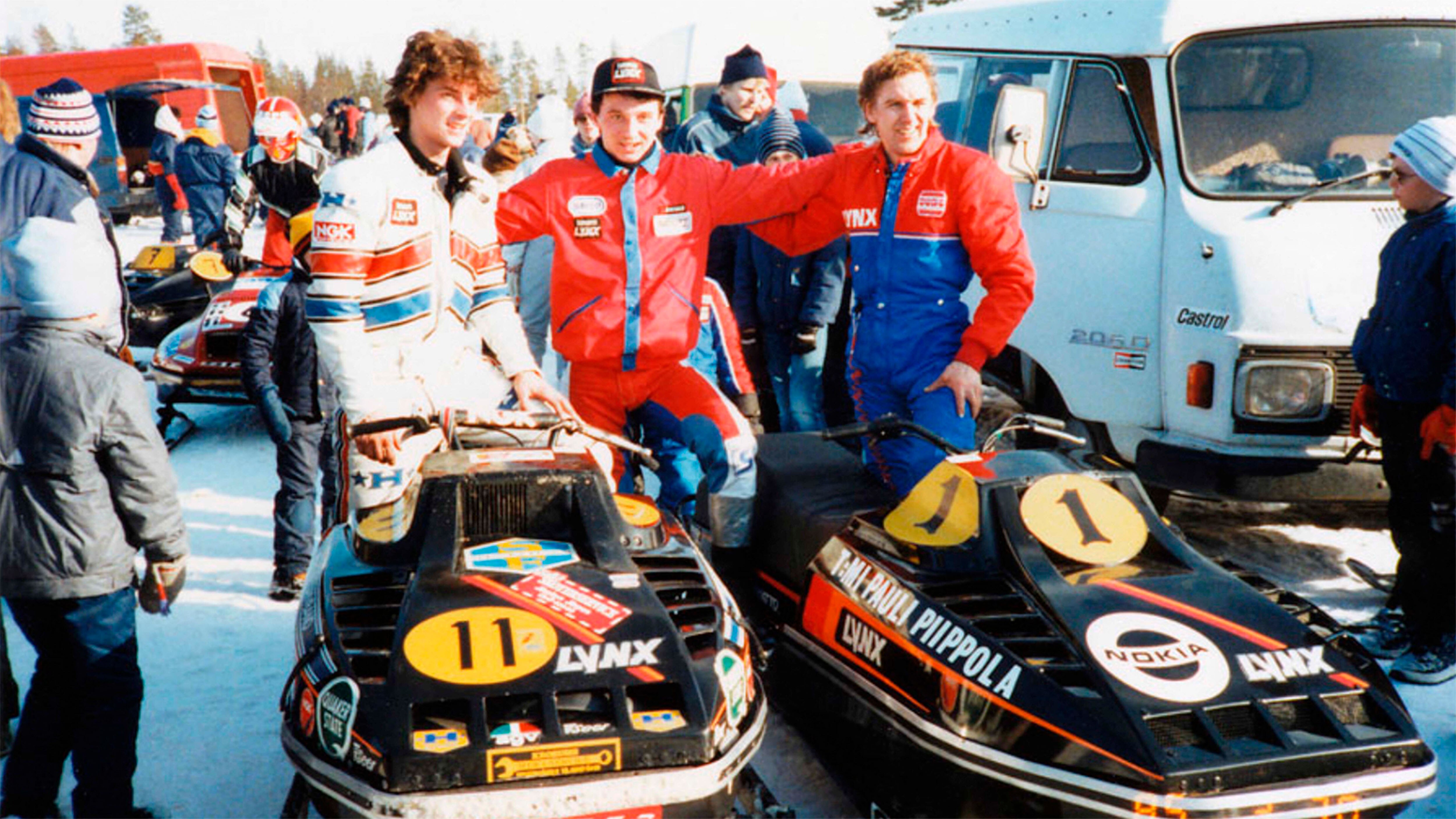 Champions on the track. Pauli Piippola riding "Tinplate nose", the first Lynx racing sled. The sled came into existence in the hands of Juhani Tapio, Esa Kolppanen and Piippola as an informal garage project in 1982. The Lynx's success story began with the Tinplate nose’s first race in Kemijärvi in the winter of 1983.